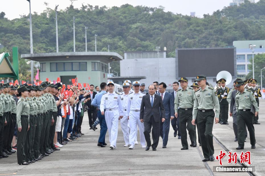 香港特区政府政务司司长张建宗、驻香港部队司令员陈道祥等嘉宾,以及香港社团、青少年代表和驻香港部队海陆空三军官兵代表等近500人出席欢送仪式,军乐队奏响《欢送进行曲》,分区列队的编队官兵和码头送行人员互相挥手致意、依依惜别。编队靠泊香港期间,受到了香港特区政府和市民的热烈欢迎,超过1.5万名香港社团和青少年团体成员参观了编队舰艇,并现场体验模拟使用码头陈列的枪械装备。图为香港特区政务司司长张建宗、驻香港部队司令员陈道祥等嘉宾,以及香港社团、青少年代表和驻香港部队海陆空三军官兵代表等近500人出席欢送仪式。中新社记者 李志华 摄