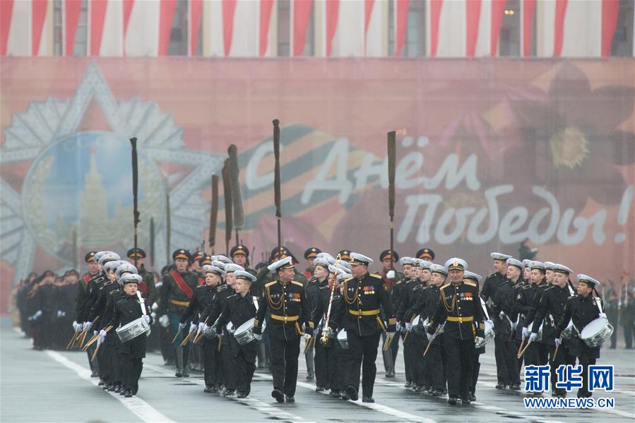5月7日,在俄罗斯圣彼得堡冬宫广场,参阅人员在雨中进行阅兵彩排。 当日,圣彼得堡举行卫国战争胜利74周年阅兵式彩排。 新华社发(莫京娜 摄)
