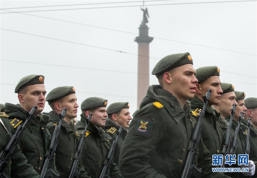 5月7日,在俄罗斯圣彼得堡冬宫广场,参阅人员在雨中进行阅兵彩排。 当日,圣彼得堡举行卫国战争胜利74周年阅兵式彩排。 新华社发(莫京娜 摄)