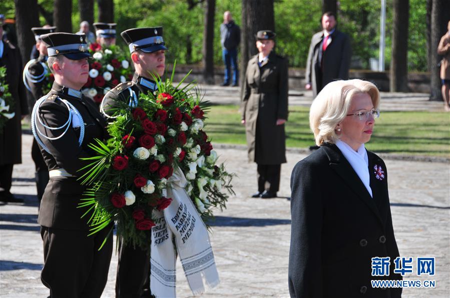 5月8日,在拉脱维亚首都里加,拉脱维亚议长穆尔涅采(右)参加献花仪式。 拉脱维亚当天在位于里加的阵亡将士公墓举行献花仪式,纪念二战胜利日并悼念二战牺牲者。 新华社发(亚尼斯摄)