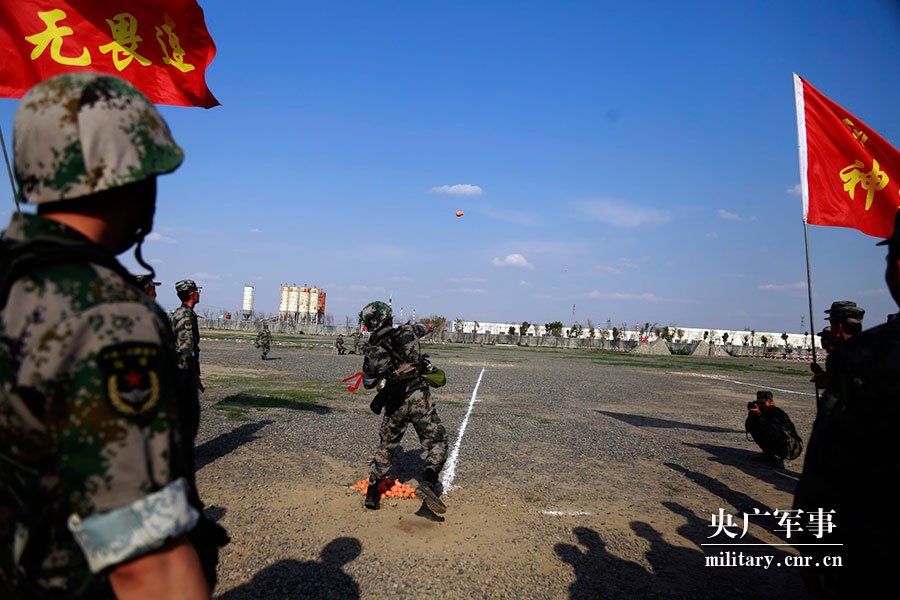 走进手榴弹投远比武场,“3号59米!4号63米!”竞赛选手激情四射,比武现场捷报连连。在进行单个人员的投远比拼后,团体赛的手榴弹投准更加激动人心。以8人各自成组,在距离参赛小组30米的地方设置直径3米的环形坑,采取接力方式,每名小组成员命中2枚有效弹,下一名选手才能投掷,用时少的一方胜出。队员们彼此加油打气,势必要在团体中贡献出自己最大的力量。
