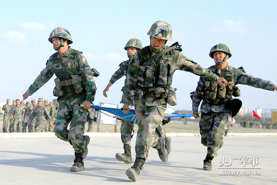 来到搬运伤员比武场,竞赛人员4人成组,将承70公斤重的麻袋放置在担架中,完成100米x2距离的折返跑。