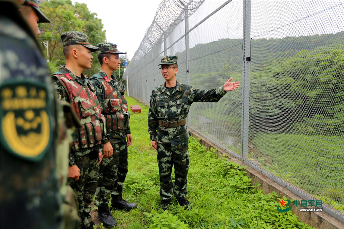 5月14日,指导员何小雨(右一)为新成员介绍勤务情况。