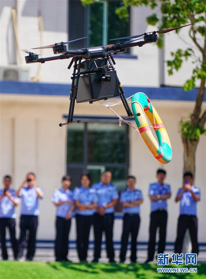 5月20日,学员在培训班上观看无人机进行空中抛投救生圈演示。 当日,全国警用无人机教官考官培训班在位于文安县的河北省廊坊市公安局训练基地开班。 新华社记者 邢广利 摄