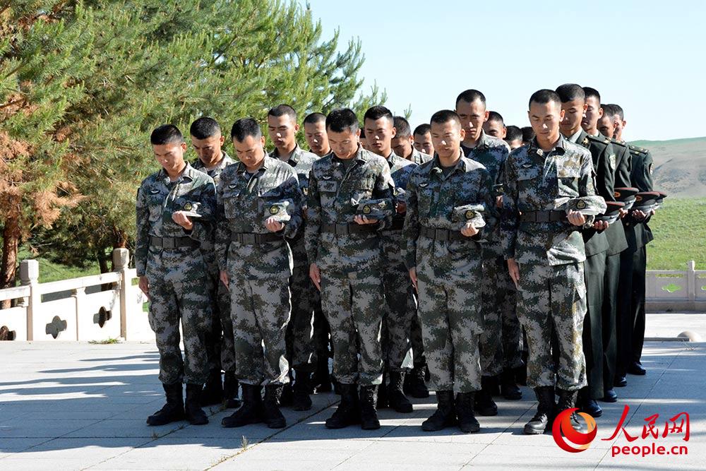 塔城军分区塔斯提边防连战士脱帽默哀。萨妮娅 摄