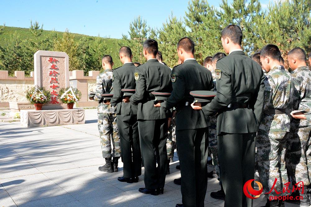 塔城军分区塔斯提边防连战士脱帽默哀。萨妮娅 摄
