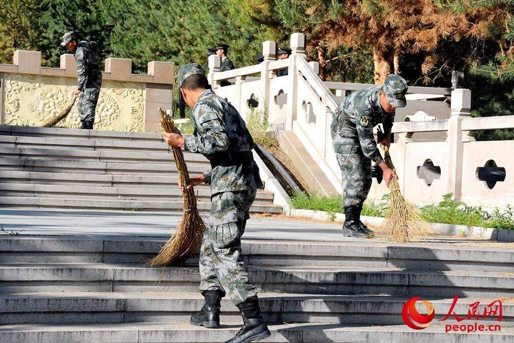 塔城军分区塔斯提边防连战士祭扫孙龙珍烈士墓。萨妮娅 摄