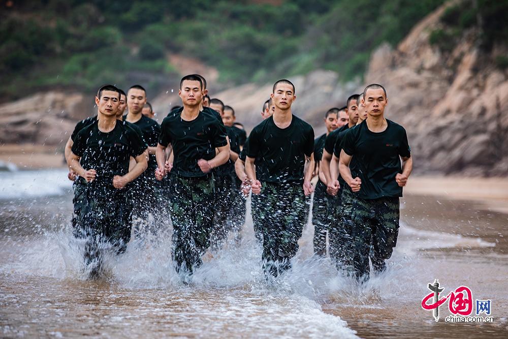 中队组建之初条件非常艰苦,当时没有体能训练场,中队便集思广益,利用驻地多山靠海的地理特点,想出了很多招数进行训练。并且总结出了“十大最喜爱的体能科目”,分别是冲坡、冲楼梯、扛水冲178高地、扛假人、推轮胎、跳绳、沙滩俯卧撑、沙滩蛙跳、绕电站长跑、扔石头等等,这些体能科目交替进行,让官兵们又爱又恨。中国网记者 郑亮摄