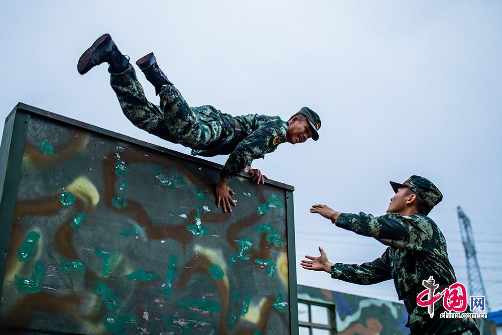 中队里有着“比、学、赶、帮、超”的优良传统。在训练和学习上,中队战士之间既是亲密的战友又是“竞争对手”。军事训练成绩突出的钟炜升和黄必聪便是这样一对“冤家”。他俩一个体能好,一个障碍训练强,每次比赛都会暗暗较劲。但在平时的结束了规定训练内容的“较量”后,战友们却经常会在训练场上看到这样的场景,黄必聪在进行器械训练,钟炜升在旁边指点和保护,而当钟炜升加练障碍时,在障碍旁一定会有张开双臂的黄必聪。中国网记者 郑亮摄