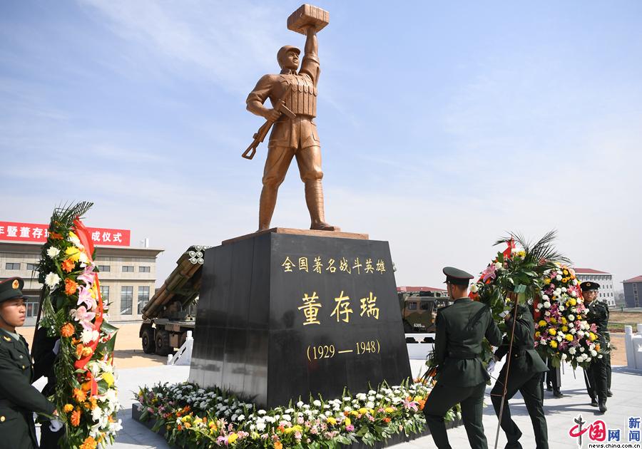 向董存瑞雕像敬献花篮。