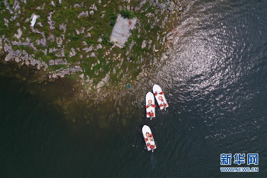 6月2日,武警官兵在贵州省清镇市红枫湖开展冲锋舟孤岛救援训练(无人机拍摄)。