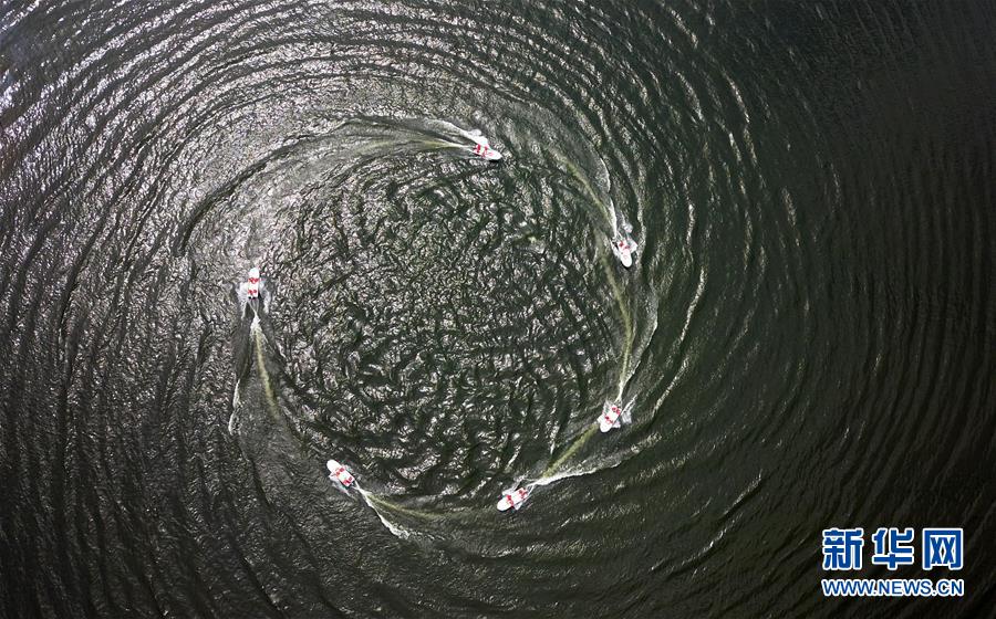 6月2日,武警官兵在贵州省清镇市红枫湖开展冲锋舟编队航行训练(无人机拍摄)。