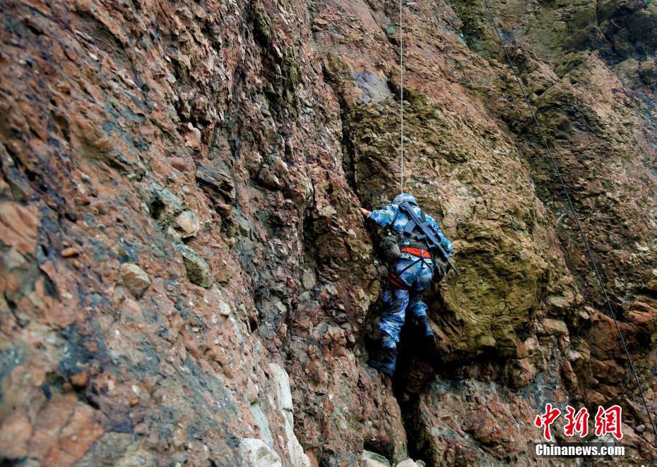 日前,海军陆战队某旅侦察营赴某海岛进行专业强化训练。他们从严从难从实战出发,依托陌生丘陵、丛林等地形地貌以及废弃建筑物,对军事地形学、牵引横越、反恐演练、战斗射击等10余个科目加钢淬火,提高遂行使命任务的能力。图为陆战队员绝壁攀岩。中新社发 尚文斌 摄
