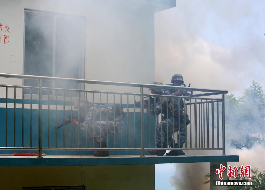 日前,海军陆战队某旅侦察营赴某海岛进行专业强化训练。他们从严从难从实战出发,依托陌生丘陵、丛林等地形地貌以及废弃建筑物,对军事地形学、牵引横越、反恐演练、战斗射击等10余个科目加钢淬火,提高遂行使命任务的能力。图为陆战队员们进行反恐演练。中新社发 尚文斌 摄