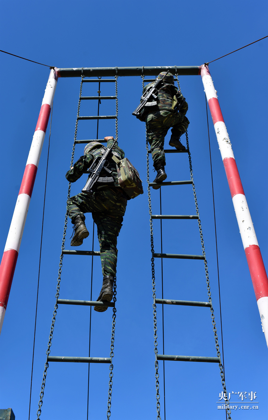 两名特战队员在攀爬软梯。