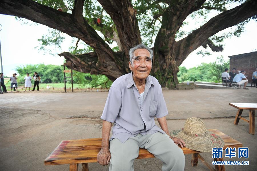 6月22日,李梅德老人坐在新田村一棵970多年树龄的古榕树下。 新华社记者 李任滋 摄