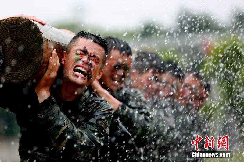武装泅渡,跨跃火障,扛圆木……,多个课目转换快、时间紧、难度高,融体能、技能、战术、心理、意志于一体,特战队员一路披荆斩棘、连续作战。在苦与累、血与火的考验面前,特战队员们始终用坚强的意志和顽强的拼搏要求自己,用澎湃不止的热血点亮绚丽青春,拿挥洒如雨的汗水彰显军人本色。图为扛圆木。 余宁磊 摄