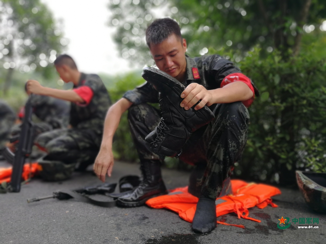 【苦】苦中作乐,休息间隙,特战队员将靴子里的水倒出。