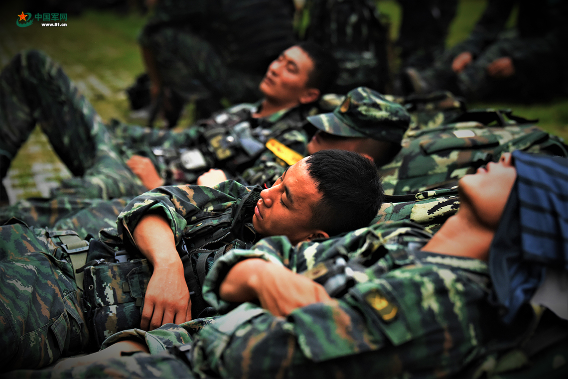 长途行军过后,特战队员林展成与战友们一起小憩。
