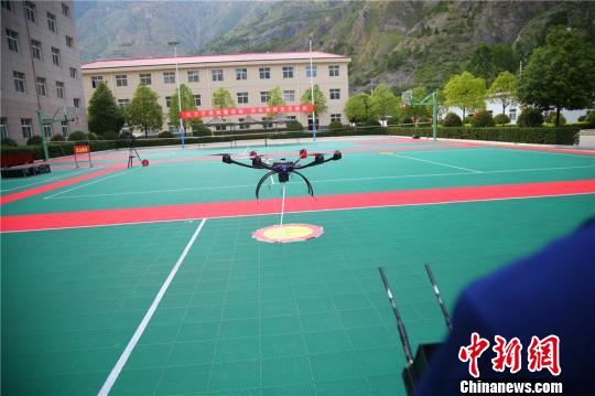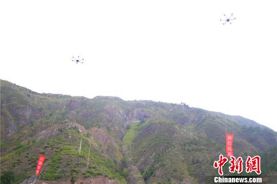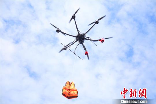 图为用无人机将逃生瓶投入指定区域。 王博悟 摄