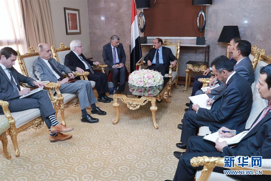 6月26日,在沙特阿拉伯首都利雅得,也门副总统阿里·穆赫辛·艾哈迈尔(中)与联合国也门问题特使马丁·格里菲思(左三)举行会谈。 据也门媒体26日报道,也门副总统阿里·穆赫辛·艾哈迈尔当天在沙特阿拉伯首都利雅得表示,也门政府将重新参与联合国主导的和平进程。 新华社发