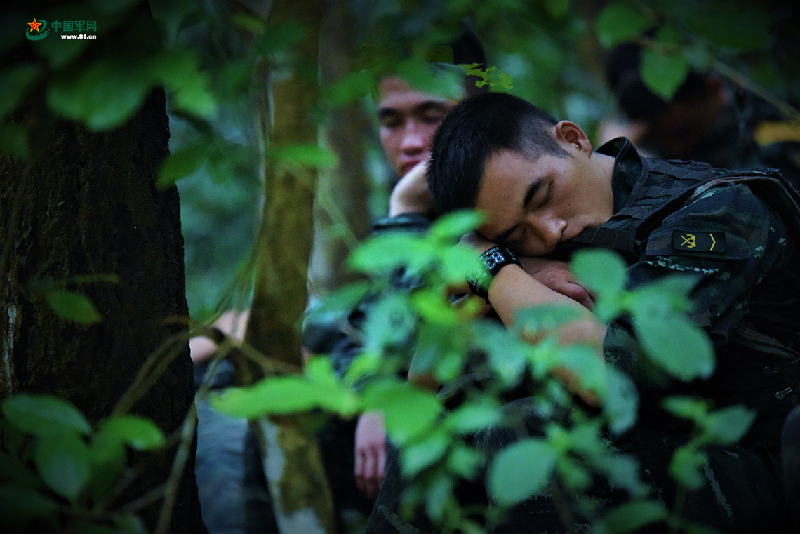 高温、酷暑、暴雨、泥潭……“魔鬼周”无情地吞噬着特战队员的体能,队员们每一天都很难受,体力严重透支,但他们却依然咬牙坚持,相互鼓励。图为行军途中王国豪(左)和唐浩(右)相互加油鼓劲。