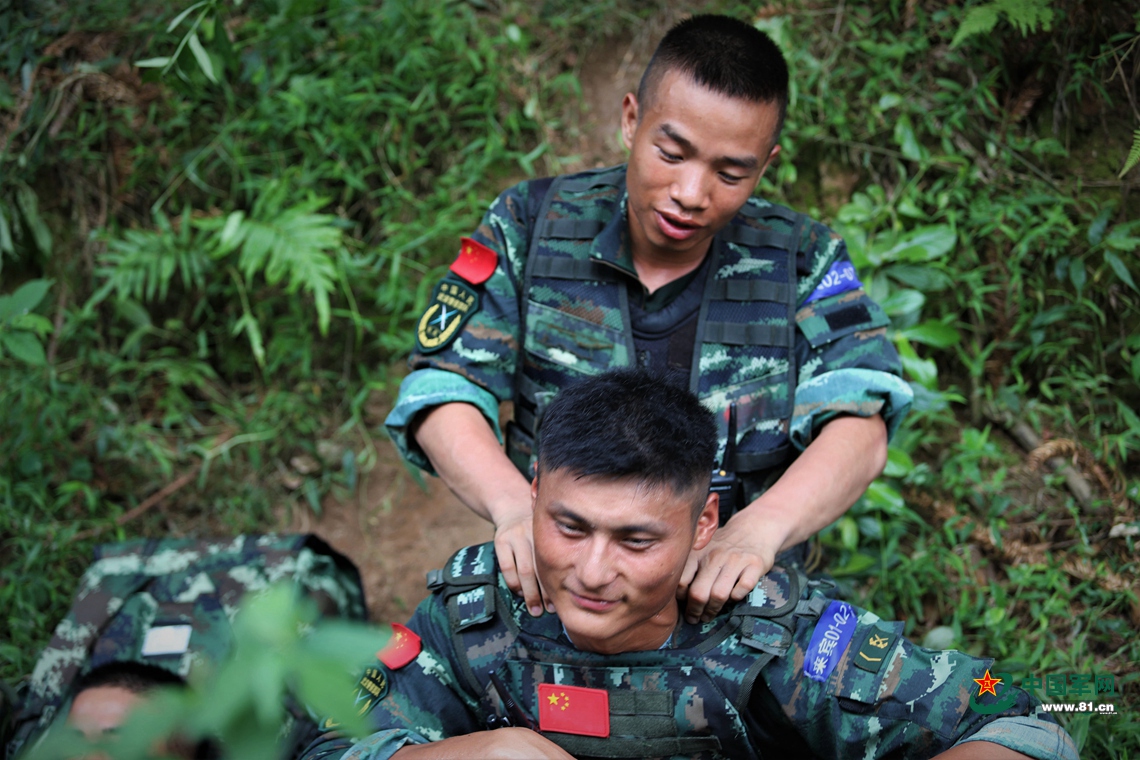 休息间隙相互捶捶背、捏捏肩,奔袭路上相互加油鼓劲,战士们很好的诠释了什么是战友情。图为休息期间,马俊杰(上)为陈健(下)捏肩捶背放松。