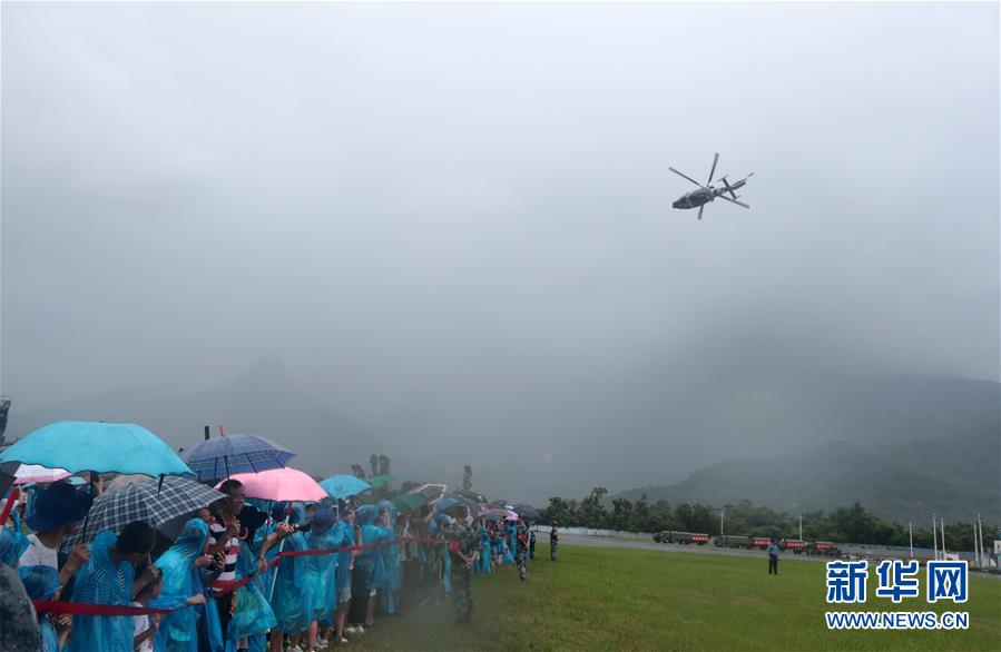 6月29日,参观军营的香港市民冒雨观看直升机飞行表演。 当日,为不断增进与香港各界的沟通与交流,解放军驻港部队石岗军营和新围军营举行开放日活动,当天吸引约两万香港市民冒雨入营参观。 新华社发(原俊敏 摄)