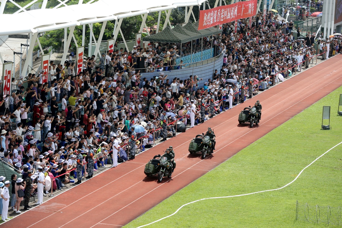 6月30日,解放军驻港部队女特种兵表演摩托车特技。新华社发(易定 摄)