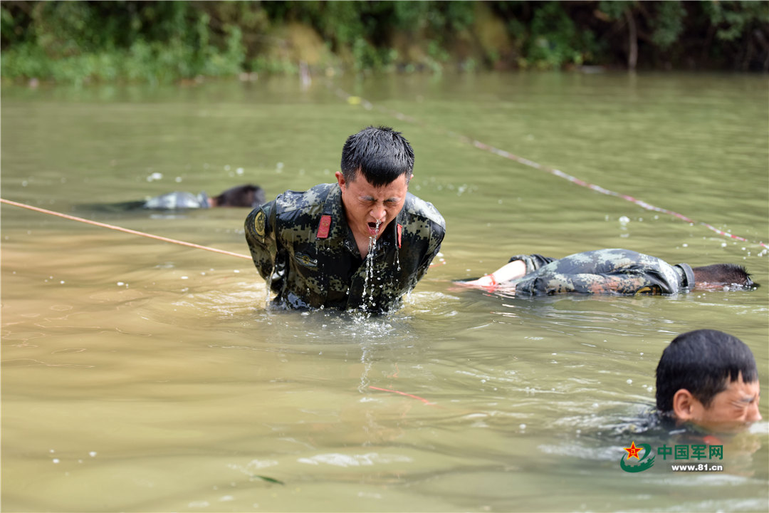 6月27日,水下逃生训练课目中一名特战队员挣脱绳索后迅速探头呼吸。