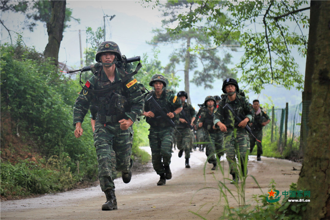 6月24日,特战队员携带30公斤的装备进行十公里武装奔袭。