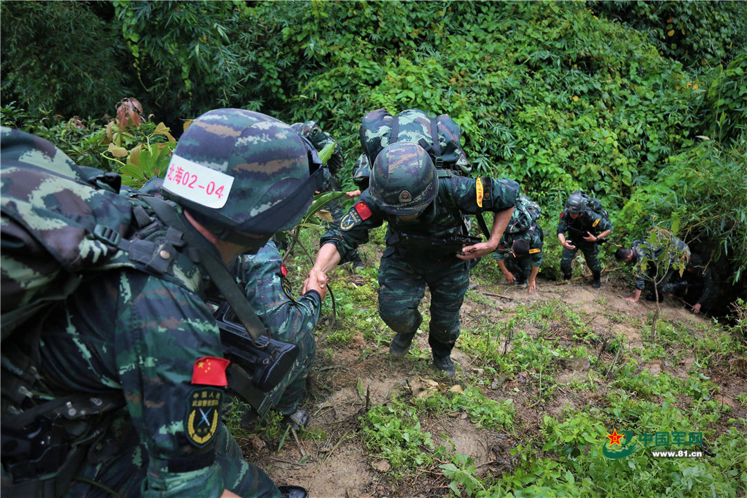 6月24日,长途行军训练课目中,特战队员相互协助攀爬山坡。