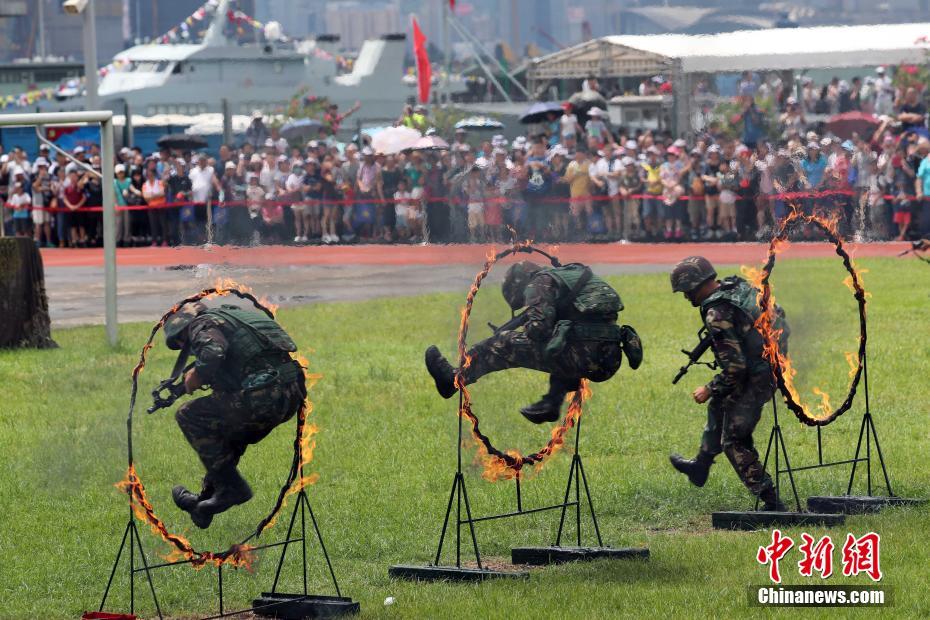 7月1日上午,驻香港部队开放昂船洲军营,让市民和青年学生近距离感受军队和军人独有的文化和魅力。当天,军营举行升旗仪式,军乐队列表演,格斗技术展示,刺杀操表演,猎人战斗表演,陆、海、空军武器装备展示,后勤保障装备与器材展示等。中新社记者 洪少葵 摄