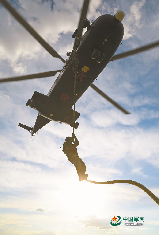 这是6月中旬,武警部队组织特战小队搭乘直升机开展反恐训练的一个场景。为加快推进新型作战力量形成实战能力,今年4月下旬以来,武警部队组织数百名特战精英、飞行骨干在高原大漠等复杂地域,进行了为期两个月的空地融合训练和比武竞赛,着力锤炼侦察、投送、搜索营救、跟踪追捕等特战技能。