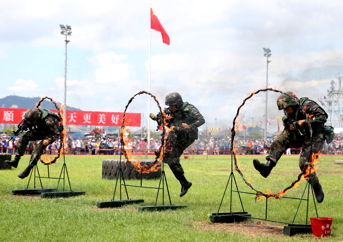 7月1日,解放军驻港部队官兵表演穿越火障。新华社发(易定 摄)