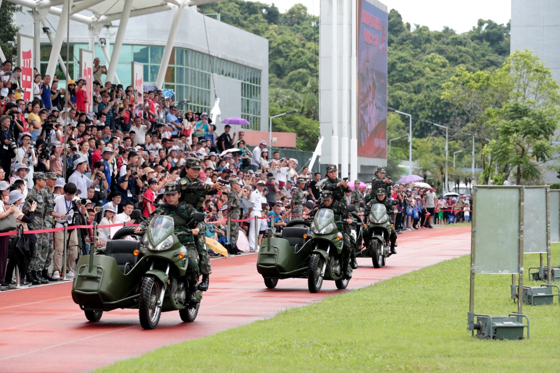 7月1日,解放军驻港部队女特战队员表演摩托车特技驾驶和射击。新华社发(原俊敏 摄)