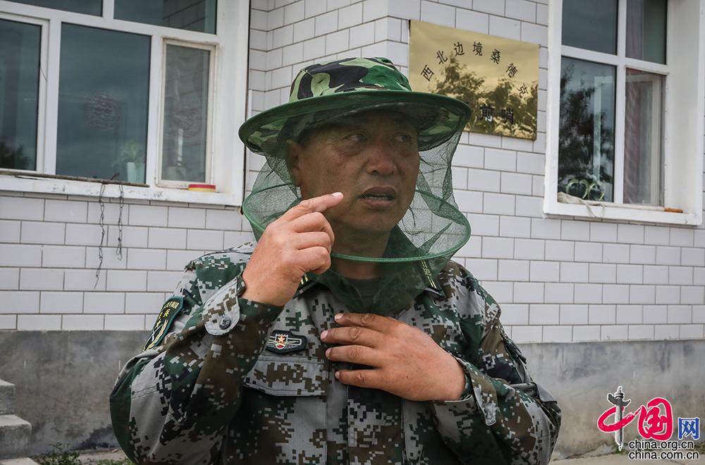 马军武展示用来防止蚊虫叮咬的“装备”。在这里生活的人都说,一年可能会“死”四次:春天被洪水吓死,夏天被蚊虫咬死,秋天被风沙刮死,冬天被冰雪冻死。夏季,这里作为世界四大蚊虫聚集地之一,一种名为“小咬”的虫子肆虐,能将牲口咬死,巡逻时为防止叮咬,马军武会用一块在柴油中浸过的纱布顶在头上,脸上时常被烧得火辣辣;冬季,气温近零下40度,狂风暴雪频发,冰雪封路长达半年,与世隔绝。