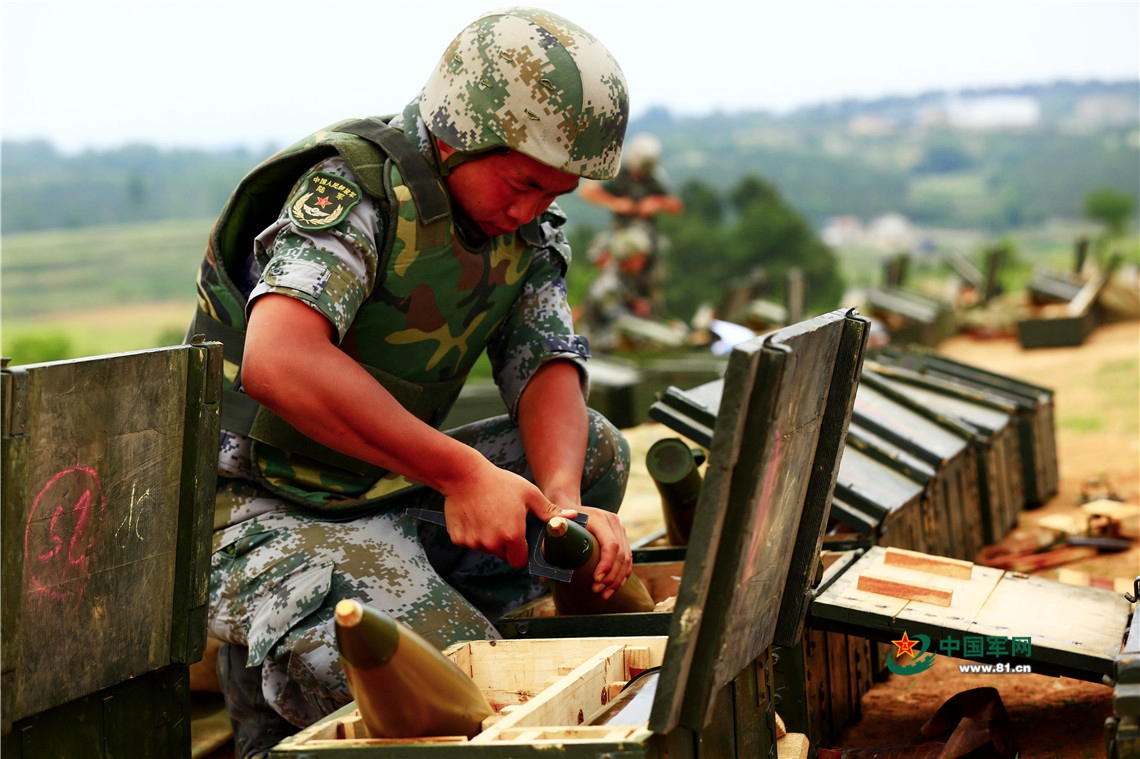 实弹射击准备阶段,炮手检查炮弹。