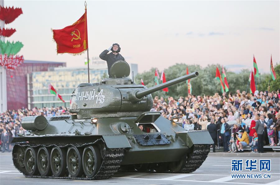 7月3日,在白俄罗斯首都明斯克,T-34坦克参加独立日阅兵式。 白俄罗斯3日晚在首都明斯克举行盛大阅兵式,庆祝白俄罗斯独立日暨二战中从德国法西斯占领下解放75周年。 新华社记者魏忠杰摄
