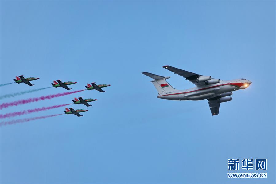 7月3日,在白俄罗斯首都明斯克,白俄罗斯一架伊尔-76运输机和5架L-39教练机从天空飞过。 白俄罗斯3日晚在首都明斯克举行盛大阅兵式,庆祝白俄罗斯独立日暨二战中从德国法西斯占领下解放75周年。 新华社记者魏忠杰摄