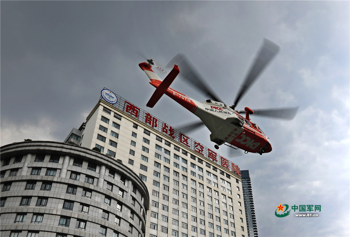 7月2日,西部战区空军组织一架通航公司救援直升机在西部战区空军医院机降场进行起降飞行训练。