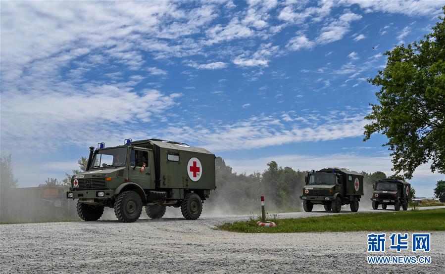 这是7月5日在德国费尔德基兴训练基地拍摄的中德“联合救援-2019”卫勤实兵联合演习整合训练现场。新华社记者 连振 摄