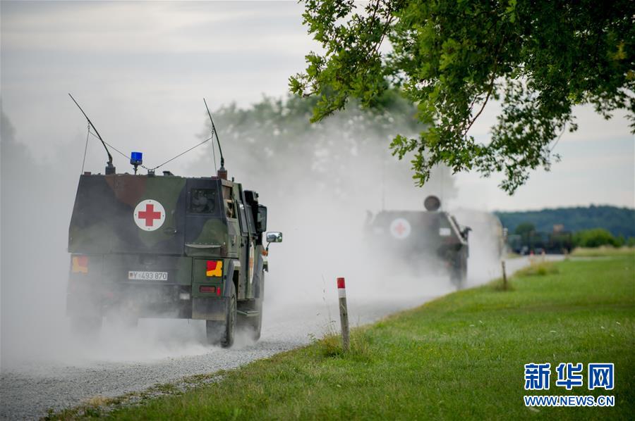 这是7月5日在德国费尔德基兴训练基地拍摄的中德“联合救援-2019”卫勤实兵联合演习整合训练现场。新华社记者 连振 摄