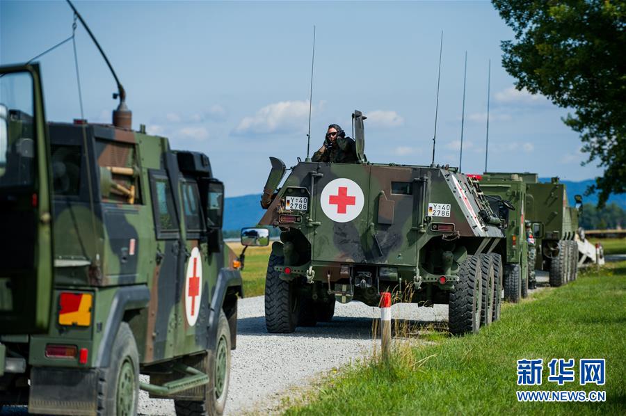 7月9日,在德国费尔德基兴卫勤训练基地,中德双方参演部队进行全要素全流程连贯演习。 当日,中德“联合救援—2019”卫勤实兵联演举行开幕式,开启为期两天的全要素全流程连贯演习。这是我军卫勤力量第一次实兵实装成建制赴欧洲开展联合演练。 新华社记者 连振 摄