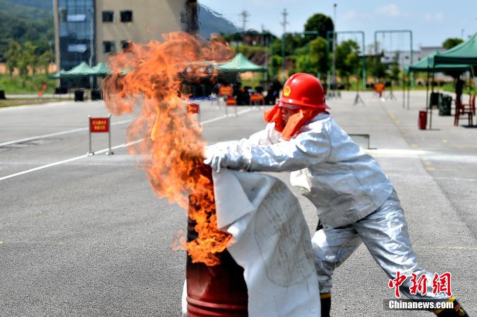 图为参赛队员在进行油料初期火灾扑救比武竞赛。文/曹峰 王肸 图/曹峰
