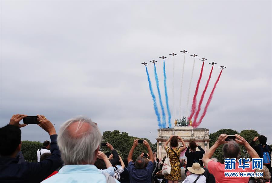 7月14日,在法国巴黎举行的国庆阅兵仪式上,“法兰西巡逻兵”飞行表演队飞过卢浮宫金字塔广场附近的小凯旋门上空。 当日,法国在首都巴黎举行国庆阅兵仪式。 新华社记者 高静 摄