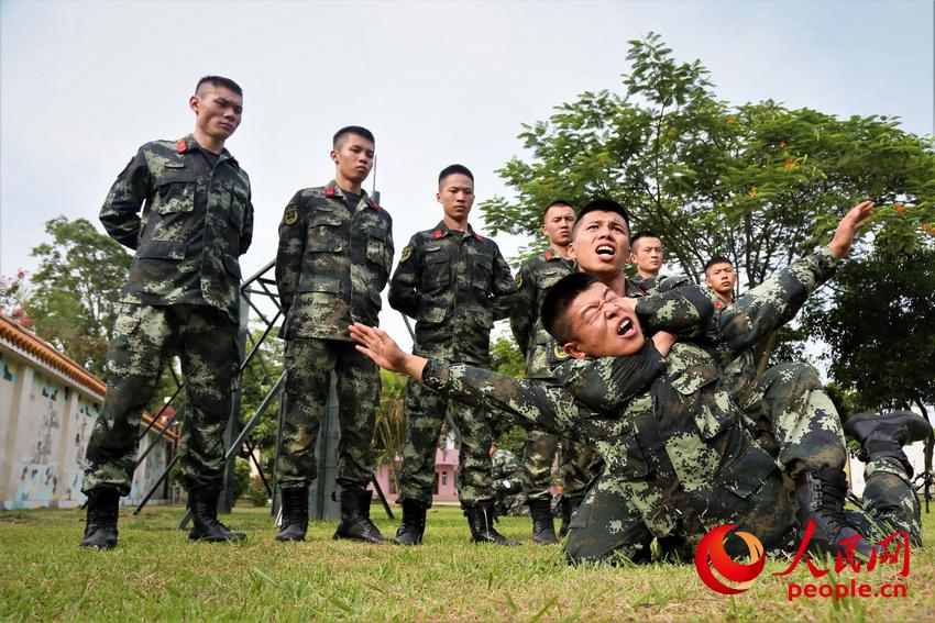 两名武警官兵在进行摔擒示范。