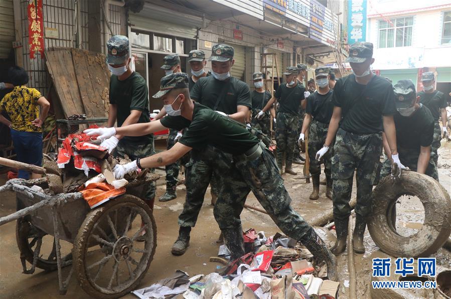武警赣州支队官兵在江西省瑞金市九堡镇菜市场合力清理淤泥和垃圾(7月19日摄)。新华社发(郑宏灿摄)