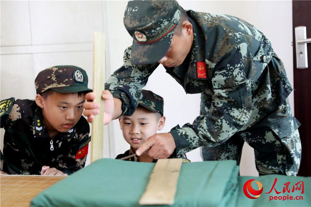 在武警百色支队官兵宿舍内,武警战士教“萌娃”叠被子。