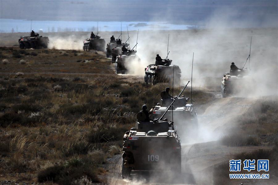 2016年9月18日,“和平使命-2016”联合反恐军事演习在吉尔吉斯斯坦巴雷克奇市举行。这是我军参演部队组织快速集结。新华社发(王宁 摄)